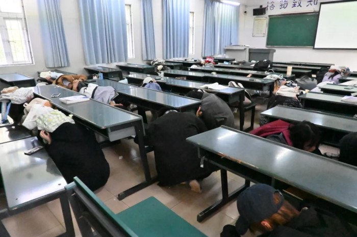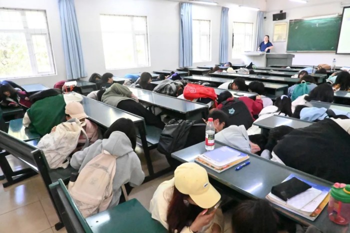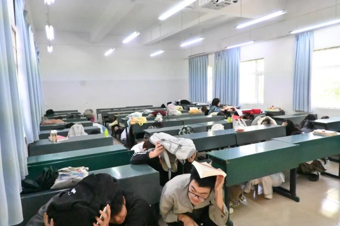 10点10 分,教学区域“地震警报 ”信号发出,授课教师们立即发出“地震来了,不要慌 ”的警示指令,组织学生迅速采取紧急避险措施,指导大家就近抱头蜷缩,安全躲在课桌下方或墙角等坚固位置。一分钟后,随着地震波模拟的逐渐减弱,全体师生迅速遵循指挥调度,严格按照既定的疏散路线,井然有序地撤离了教学区域。