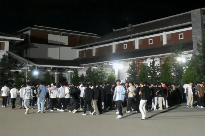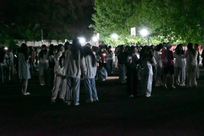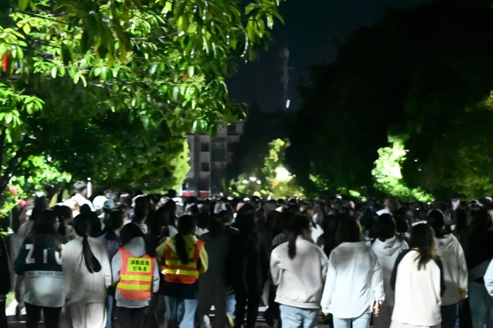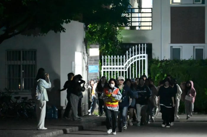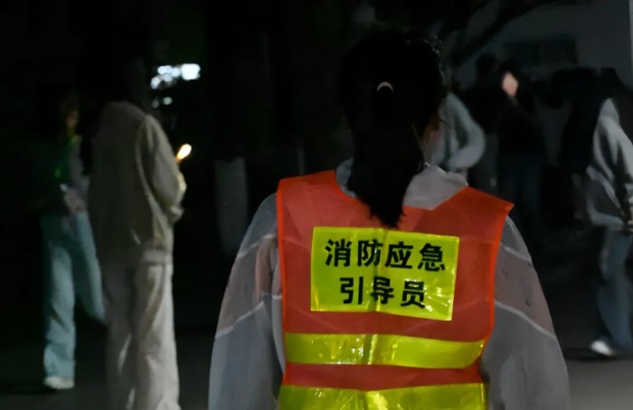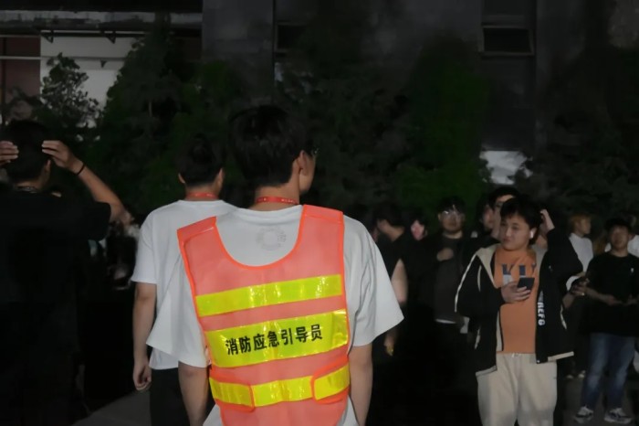 当晚21点20分,学生园区模拟警报声响起,宿管员与自律会学生迅速引导学生紧急避险。21点21分下达疏散指令,学生们按照“低楼层到高楼层依次疏散” 的原则,沿预定路线有序疏散至园区外指定安全区域。疏散结束后,各园区层长立即在指定地点进行人数清点,并严格按照舍长、层长、栋长、会长、宿管员、宿管科的层级流程逐级上报人数,确保每位同学的安全都能得到及时且准确的确认。