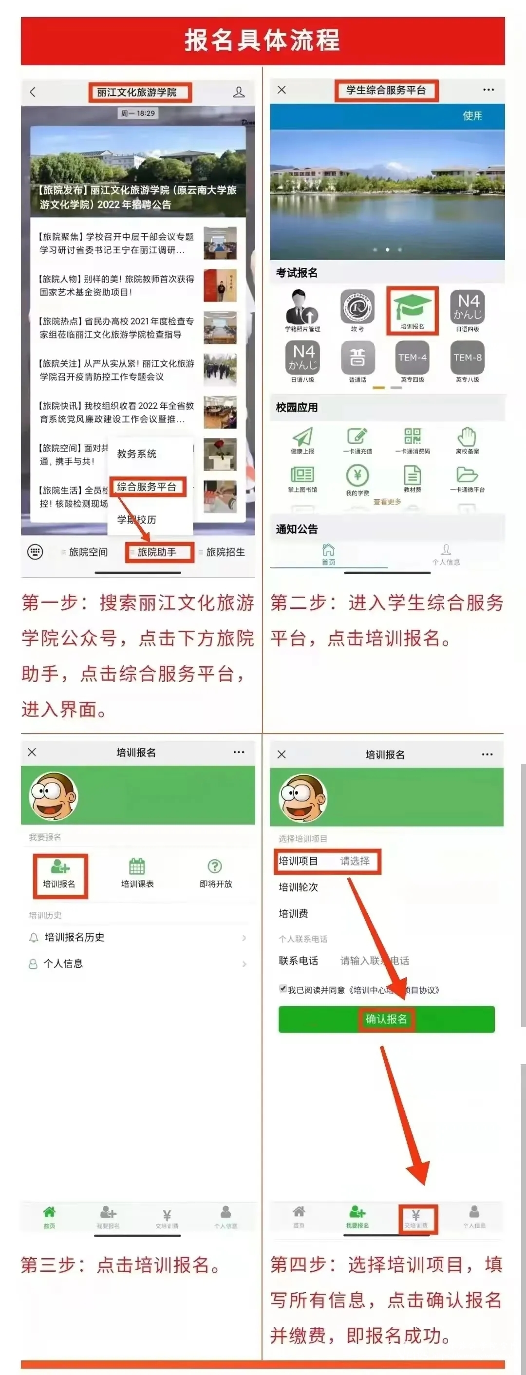 请务必仔细核对填写信息,确保准确无误,并在规定时间内完成缴费。如有疑问,可联系学校培训中心咨询。